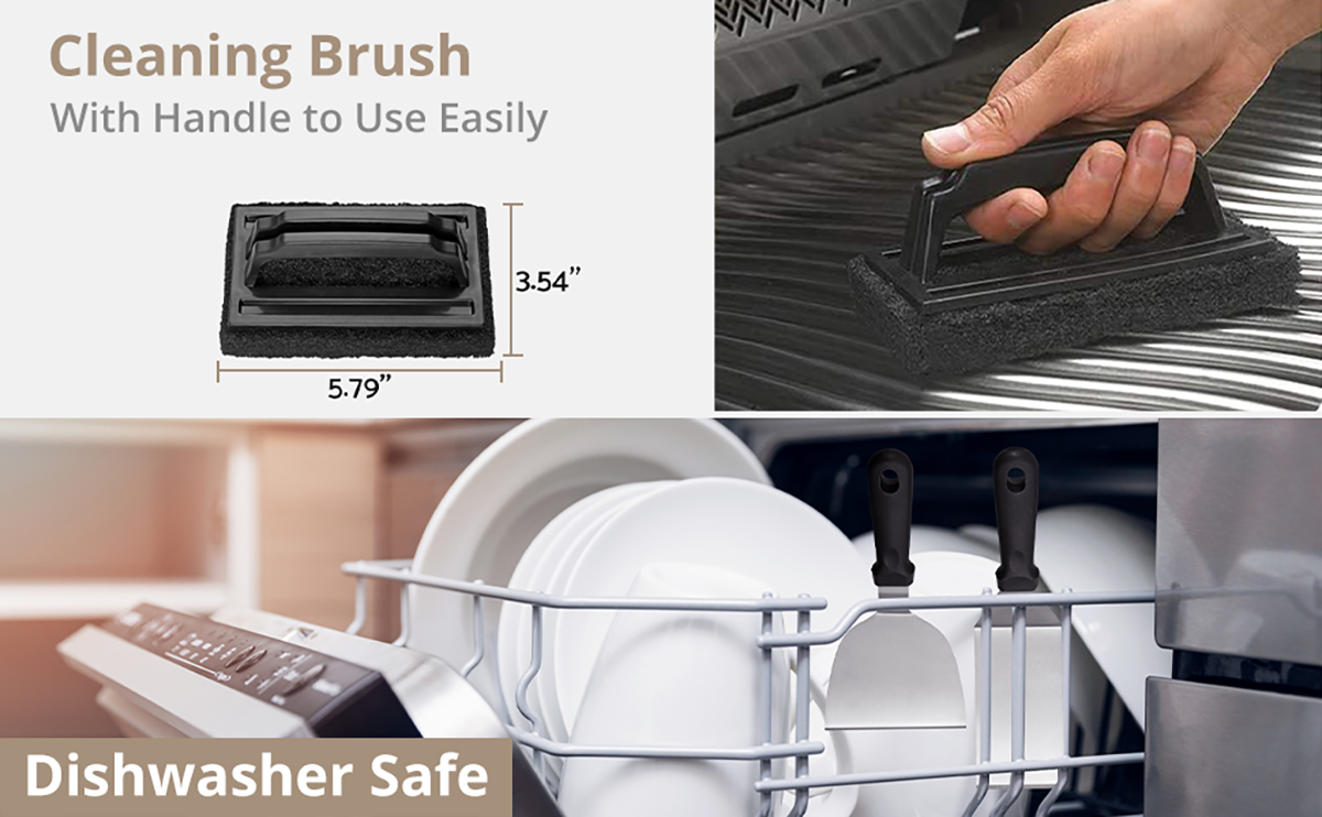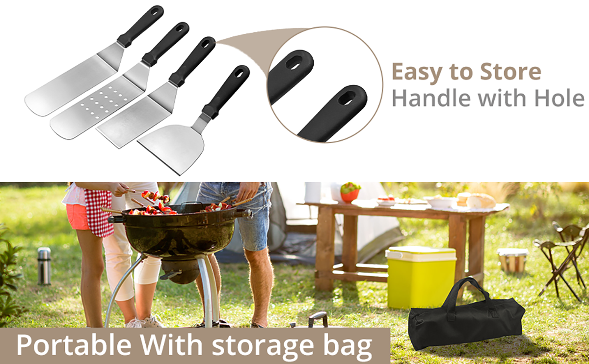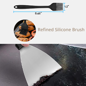 Features: *Long and short griddle spatula set for flipping all sorts of food, features high heat-resistance, the large griddle spatulas can be used for flipping beef cubes, rice, noodle and vegetables. *The shorter spatulas/turner with turner refined shape easy to flip good on griddle like turning hamburger, pancake or cutting bread,meat and sausage. *Griddle Cleaning Kit,Pack down just as fast as you cook! Flat grill scraper tool picks up all charred bits. Bristle free flat grill brush for cleaning up at the end of the day! *Stainless Steel egg rings for perfect breakfast eggs.The tip griddle tongs for picking up sizzling bacons. *Comes with carrying storage bag easy to carry, you don't have to worry about where these spatulas are stored,very suitable for indoor backyard or outdoor barbecue.