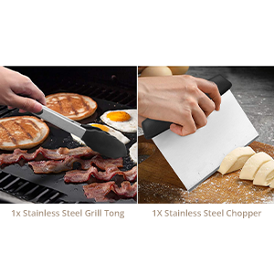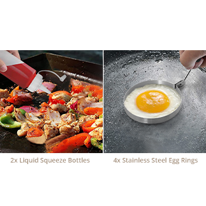 Package includes: 2 x Oversized griddle Spatulas 4 x Stainless Steel Egg Rings 1 x Stainless Steel Flipper/Turner 1 x Stainless Steel Hamburger Turner 1 x Stainless Steel Chopper 1 x Stainless Steel Scraper 1 x Stainless Steel Grill Tong 2 x Liquid Squeeze Bottles 1 x Silicone Brush 1 x Cleaning Brush 1 x Carrying Bag
